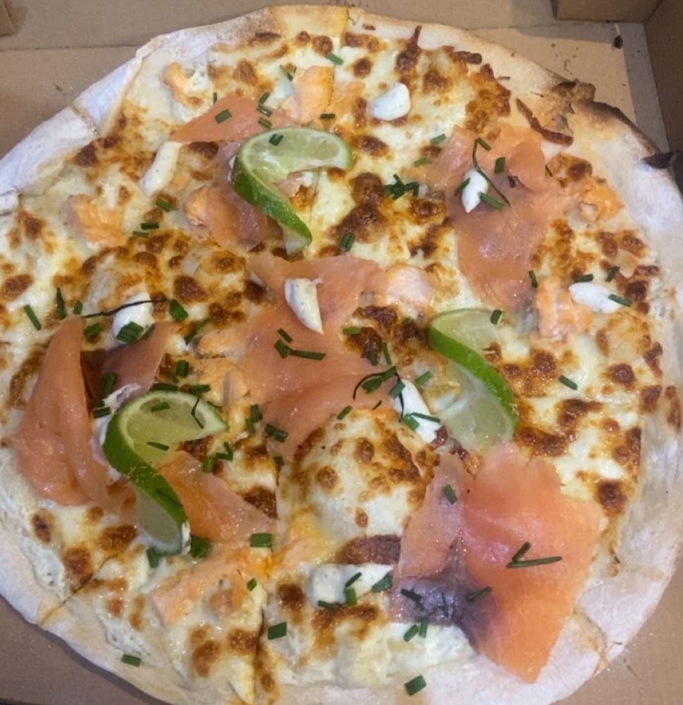 Crème fraîche, mozzarella, tranches de saumon fumé, pavé de saumon, aneth, citron vert.
