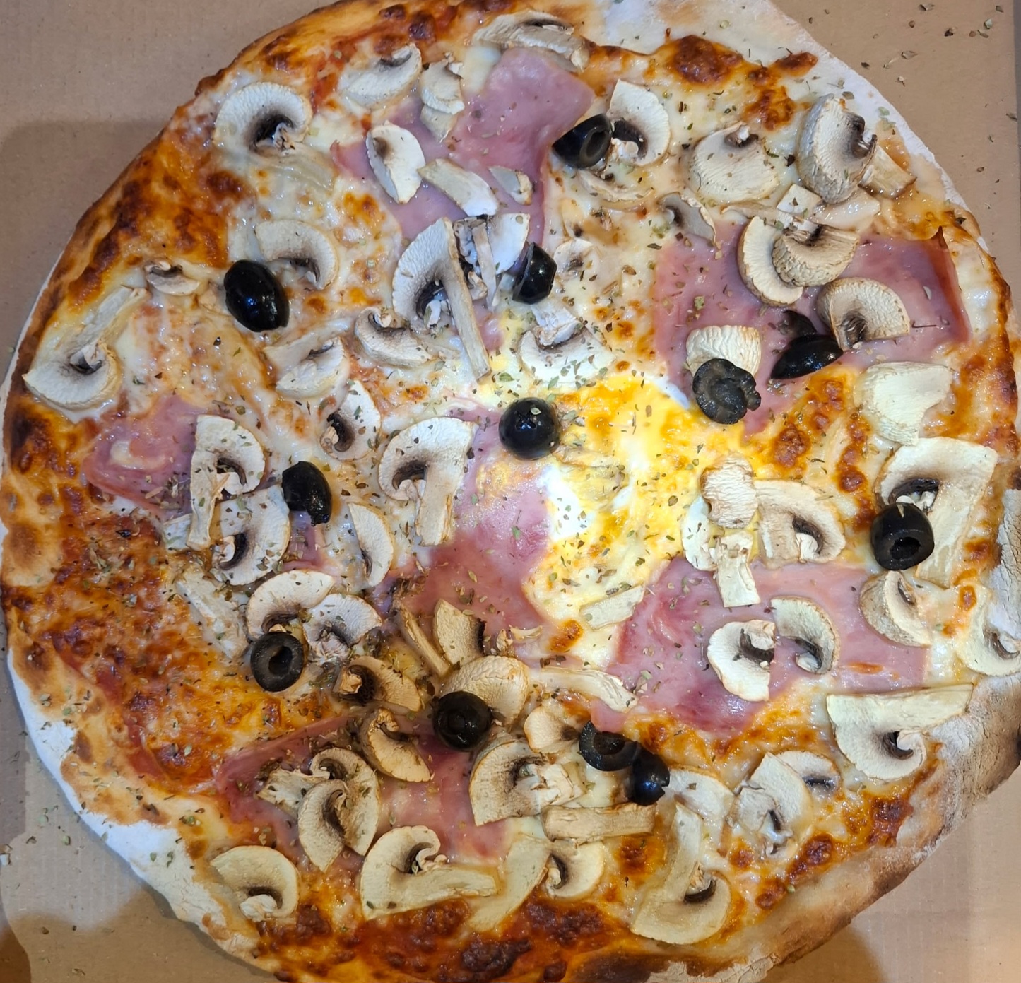 Tomate, mozzarella, champignons, jambon blanc de dinde, basilic frais, olives, origan.